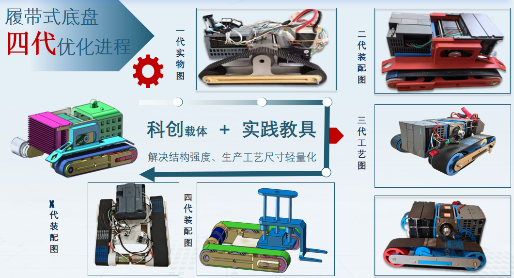 在机械结构解析环节,主讲教师介绍了履带式移动底盘的核心组成和四代底盘的设计演进过程。该底盘由"四轮一带"(驱动轮、支重轮、导向轮、托带轮及履带)、张紧装置、缓冲弹簧和行走机构构成,通过驱动轮与履带啮合传递动力,借助支重轮均匀分散车体重量,配合张紧装置与缓冲弹簧保障复杂路况下的稳定运行。团队设计四代底盘演进过程分别为:一代为奠定了作品设计基本雏形的验证机;二代优化零部件设计,通过3d打印方式加工生产,可实现精准移动定位;三代采用激光切割加工工艺和支架结构分体式设计,扩大履带轮直径和机器人整体尺寸;四代外形由“T”字形转变为平面“一”字形,底盘结构更紧凑。