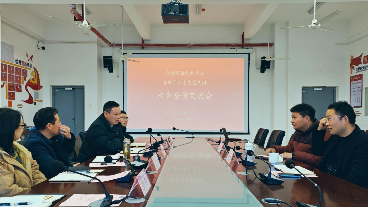 2026 年 3 月 17 日上午,合肥职业技术学院机电工程学院与合肥市人才发展集团校企合作交流座谈会在机电楼 203 会议室召开。合肥城市教育投资发展有限公司副总经理昂金虎、合肥市人才发展集团教育培训部业务经理段盛杰应邀出席。机电工程学院党总支副书记(主持工作)丁迎春、院长胡木林、副书记宋忠春、副院长高敏及相关教师出席会议。