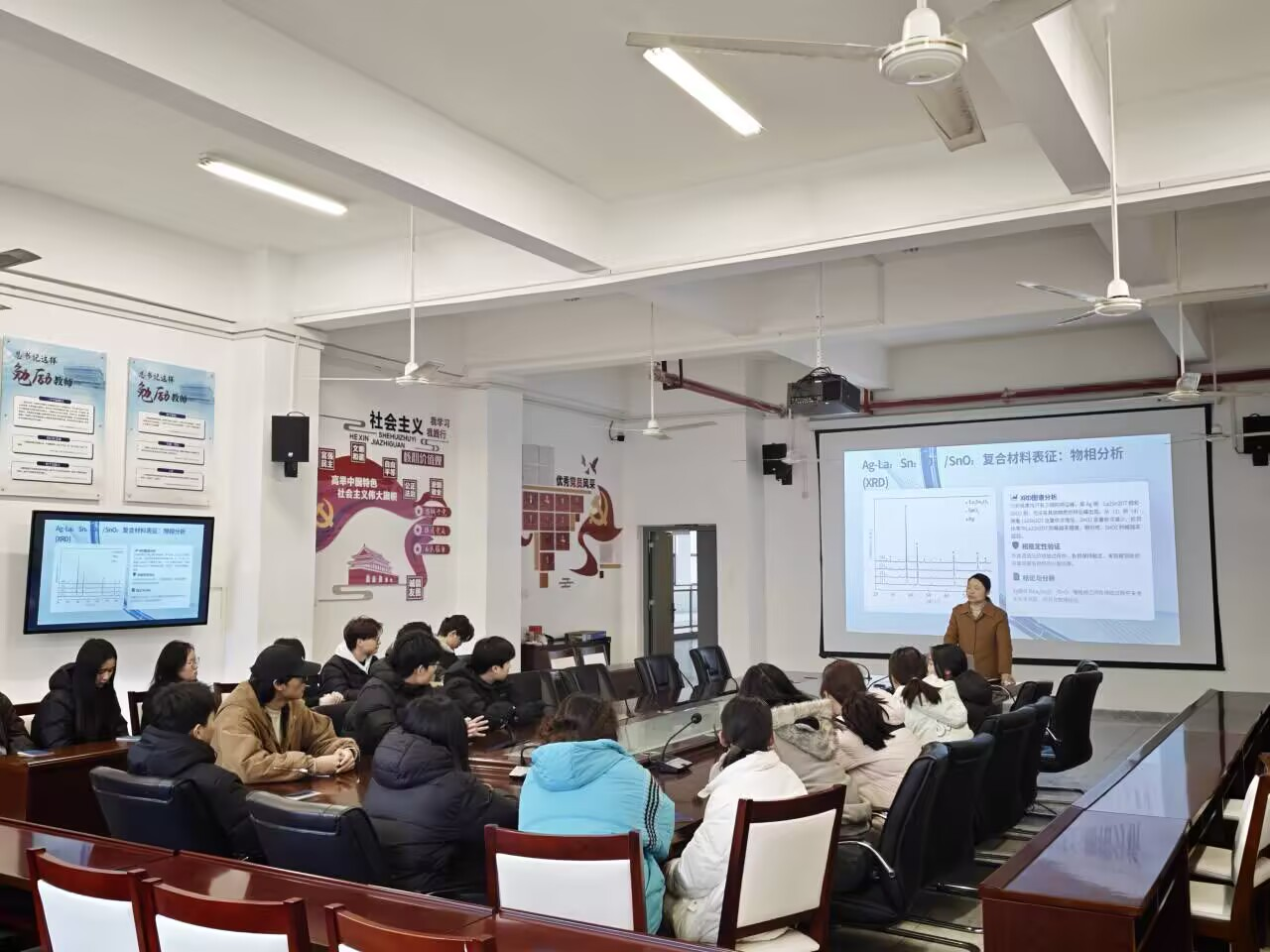 本次讲座主要有四部分内容:一是La₂Sn₂O₇/SnO₂复合粉末的合成及其表征,王娟教授详细讲解了化学共沉淀法的制备流程,并通过XRD、SEM、EDS等手段对粉末的物相组成和微观形貌进行了系统分析,指出La₂Sn₂O₇的引入显著改善了Ag与SnO₂之间的润湿性。二是Ag-La₂Sn₂O₇/SnO₂复合材料的制备与表征,通过热压烧结法制备的四组不同质量比复合材料,展现出良好的组织均匀性和界面结合性,适量La₂Sn₂O₇的加入可有效提升材料的密度、硬度、抗弯强度,并降低电阻率。三是La₂Sn₂O₇含量对复合材料电弧烧蚀性能的影响,通过高速摄像、三维共聚焦显微镜、XPS等手段分析发现,La₂Sn₂O₇的加入提高了熔池粘度,减少了材料飞溅,并通过分解吸热反应降低电弧能量,显著提升抗电弧烧蚀能力。四是不同气氛对复合材料电弧烧蚀性能的影响,实验结果显示SF₆气氛中电弧能量最低、烧蚀最轻,且生成了LaF₃保护性产物,表现出优异的灭弧性能。