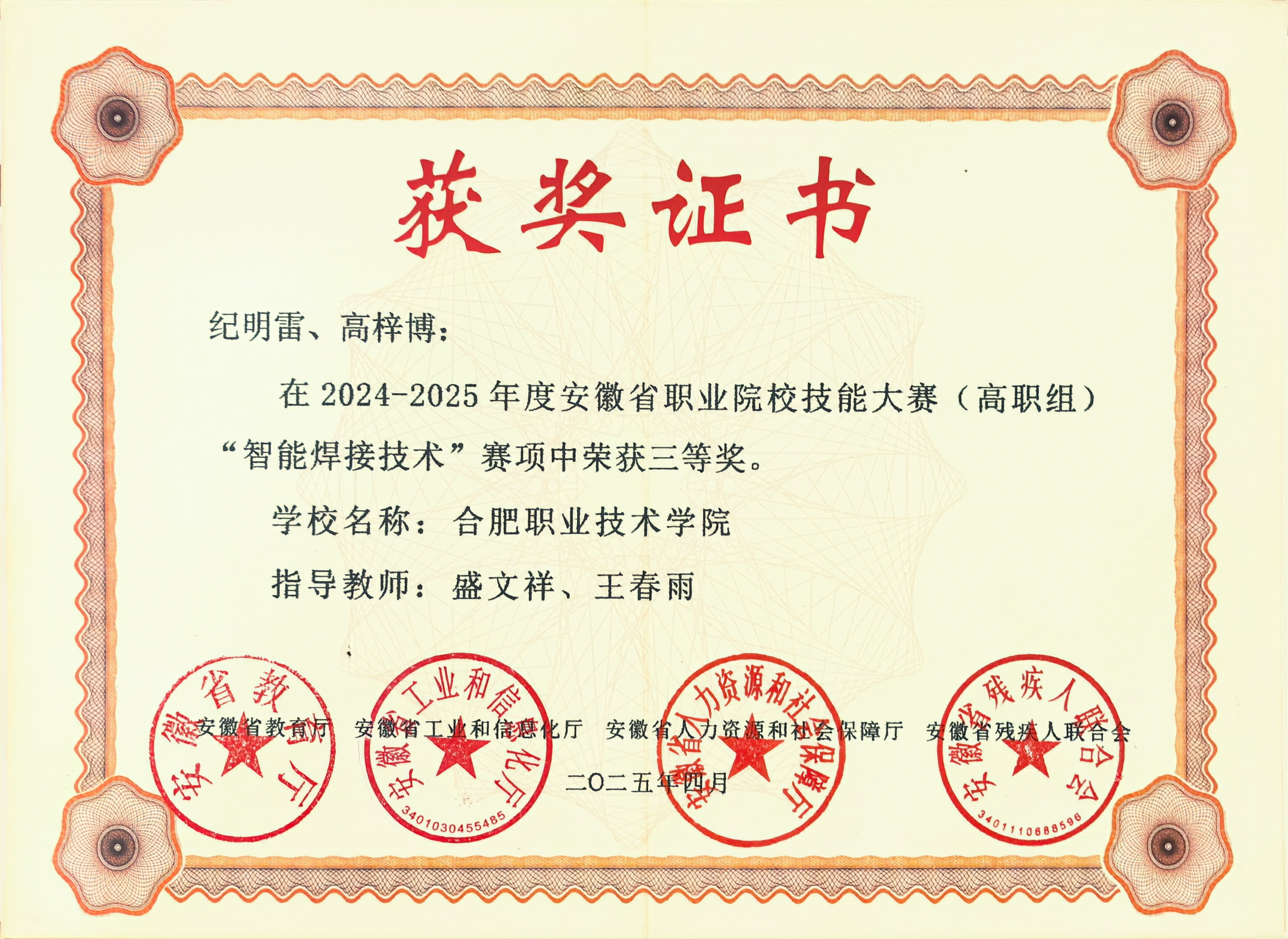 【专业建设成果】最近三年,智能焊接专业获得省级教学成果奖2项,申请省级教科研项目2项。专业学生在安徽省职业技能大赛等省级赛事中获得二等奖1项,三等奖4项。