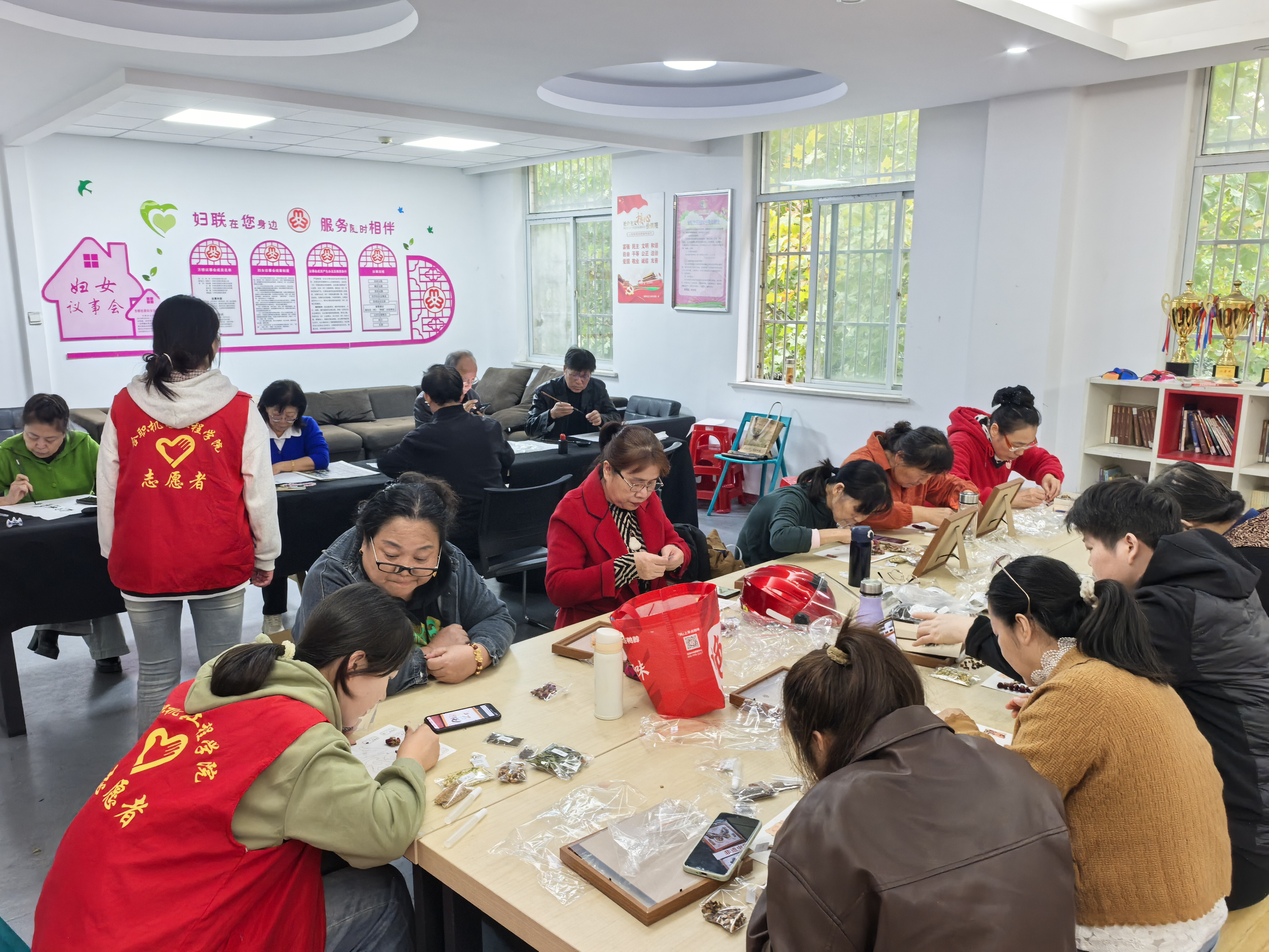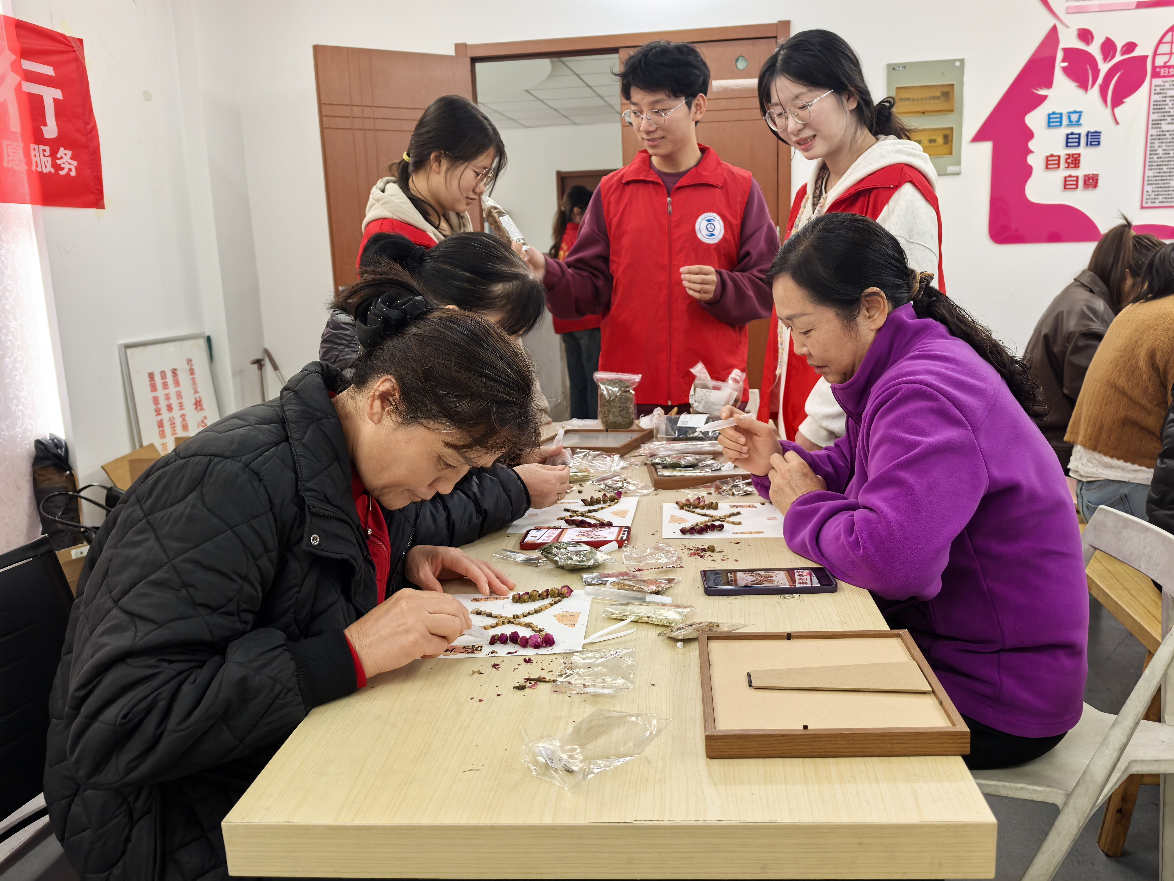 活动现场,志愿者与老人们一起动手制作非遗手工——中草药香氛画。志愿者们耐心讲解制作步骤,协助老人们挑选药材、搭配色彩、粘贴构图。有的老人小心翼翼地将艾草、菊花等中草药粘贴在画布上,不时询问志愿者是否贴得整齐;有的老人与志愿者一起讨论画面的意境,笑语盈盈,气氛温馨。另一边,几位热爱书法的老人挥毫泼墨,神情专注,一笔一画尽显功底。志愿者在一旁铺纸研墨,不时发出赞叹。一幅幅“福寿安康”、“重阳敬老”的毛笔字,不仅展现了老人们的精神风貌,也将传统文化的韵味传递给了在场的每一个人。