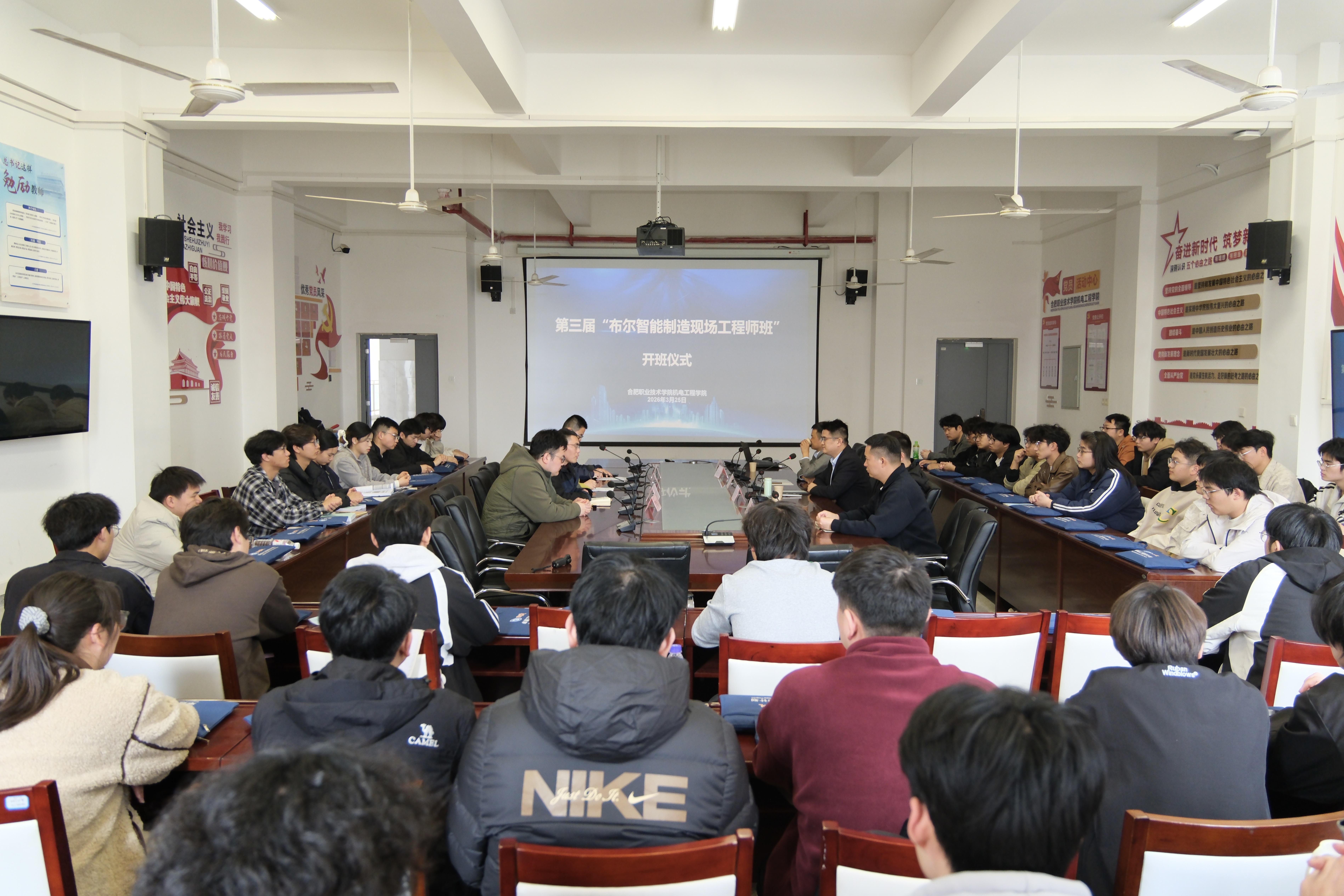 2026年3月25日下午,机电工程学院与安徽布尔自动化工程有限公司联合举办的第三届“布尔智能制造现场工程师班”开班仪式在机电楼会议室举行。安徽布尔自动化工程有限公司总经理周仕波一行,机电工程学院党总支副书记宋忠春、副院长高敏、教学办主任侯伦元、教师罗家浒以及第三届“布尔智能制造现场工程师班”全体学员参加仪式,仪式由侯伦元主持。