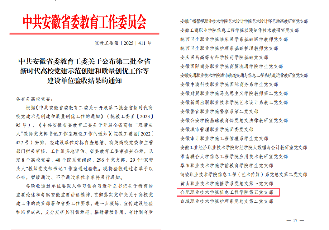 近日,根据《中共安徽省委教育工委关于公布第二批全省新时代高校党建示范创建和质量创优工作等建设单位验收结果的通知》,机电工程学院第五党支部顺利通过第二批“全省高校党建工作样板支部”验收。